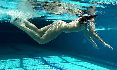 Pretty dark haired swimmer Chloe flashes tits and her pussy underwater