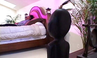 Big-titted black-haired warms up her honeypot with a rubber dildo, but feels really good from a real dick.