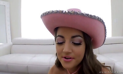 Wench in pinkish hat and lingerie Lily Adams takes a big hose in deep gullet and wet cunt